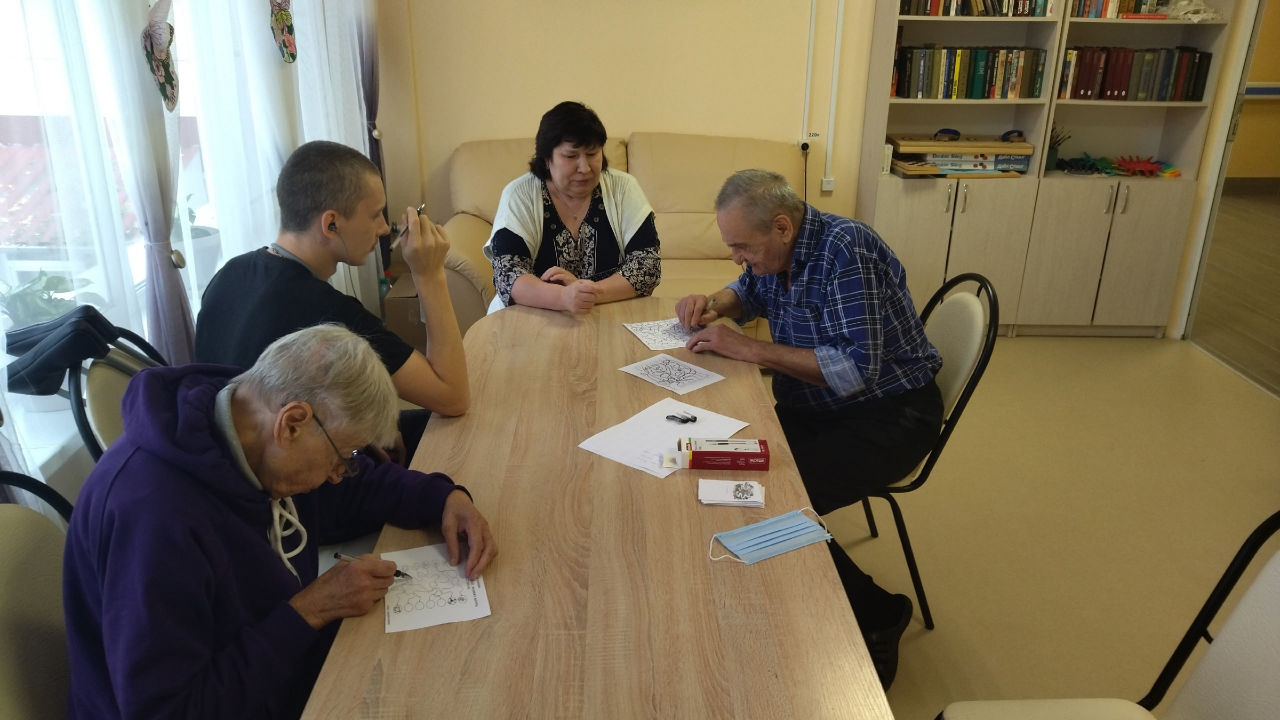 В ходе этого занятия проживающие выполняли упражнение «Перепутанные линии», «Найди пару» и решали корректурные пробы.