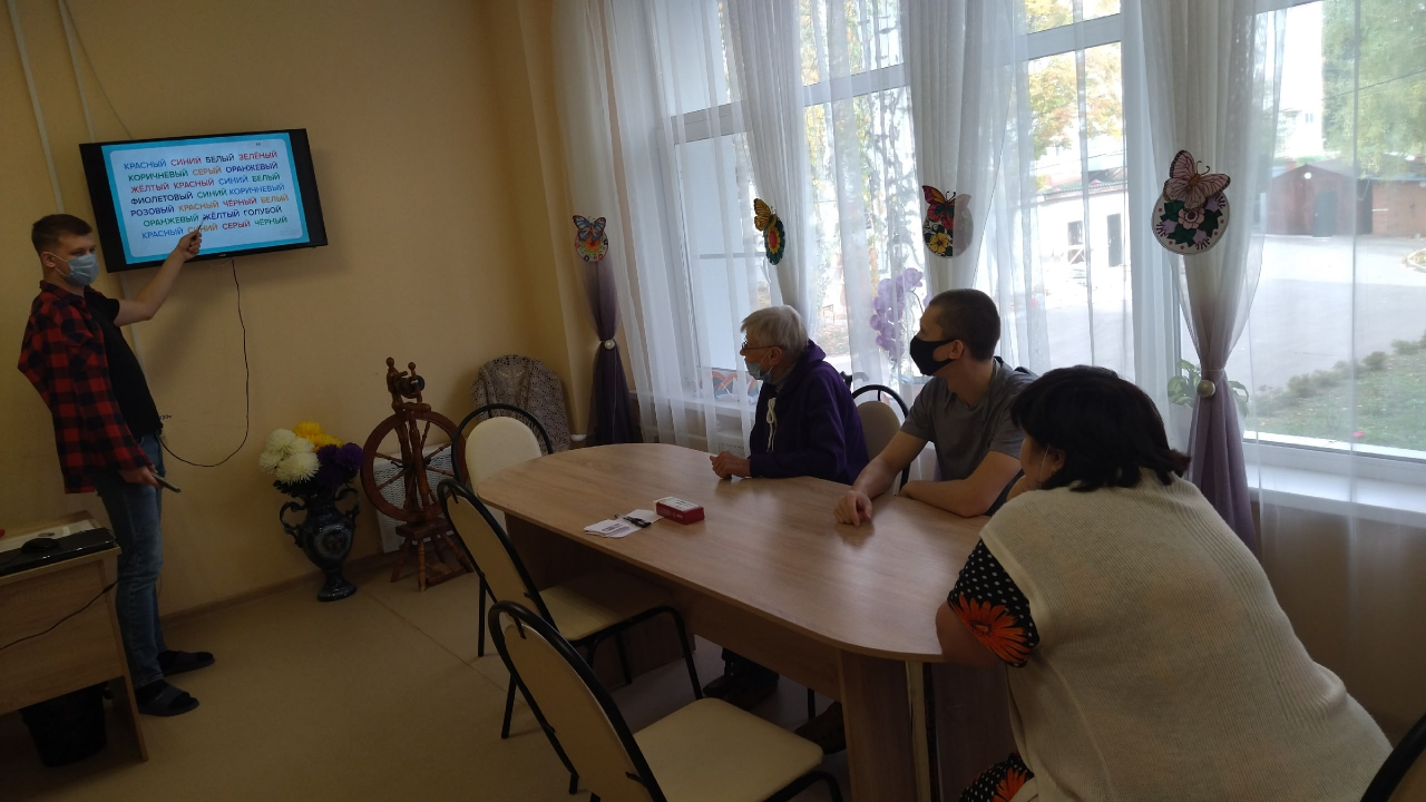 В ходе этого занятия проживающие решали струп-тест, запоминали узоры с последующим отображением их на листе и играли в развивающую игру «соотнеси картинки».