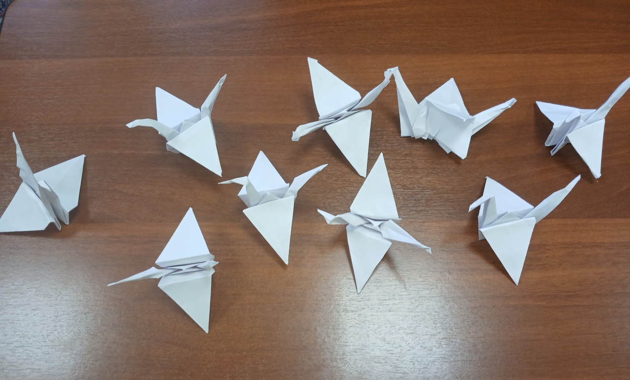 В память о Садако и всех жертвах войн, мы вместе создавали белых журавликов из бумаги, используя технику оригами. Каждый сложенный журавлик стал символом надежды и мира.