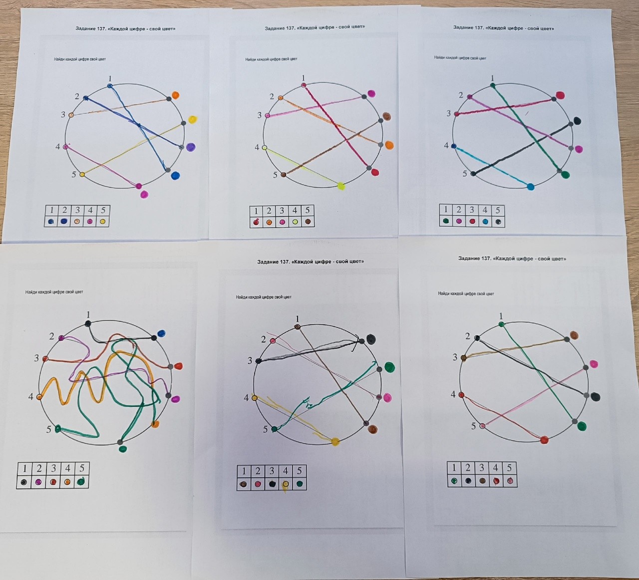 Суть упражнения проста, но эффективна: цифры располагаются по кругу. От каждой цифры отходит лабиринт, ведущий к определенному цвету. Задача участника – проследить путь лабиринта от цифры до цвета, и в таблице указать каждой цифре свой цвет.