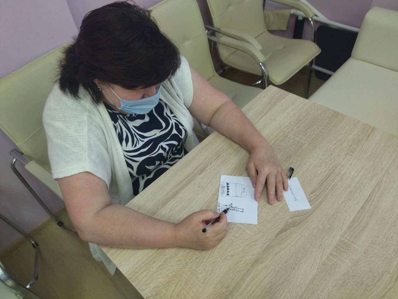 В ходе этого занятия проживающие получали карточки с написанными на них словами. Необходимо было без прямых подсказок изобразить написанное таким образом, чтобы другой участник смог разгадать, что написано на карточке.