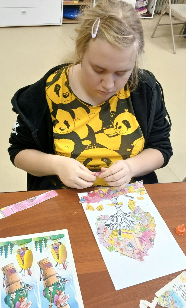 Получатели с энтузиазмом приступили к созданию композиции "Осеннее дерево". Особенность этой техники в том, что детали не вырезаются, а аккуратно отрываются и затем выкладываются в виде мозаики.