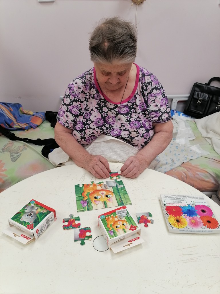 На базе структурного подразделения расположенного по адресу: Тульская область, Киреевский район, урочище "Красный лес" в рамках реализации регионального проекта «Тульское долголетие», психолог регулярно проводит интересные и полезные занятия с получателями социальных услуг, в индивидуальном формате. На очередной встрече особое внимание уделялось использованию пазлов как эффективного инструмента для поддержания когнитивных функций и повышения активности подопечных. Собирание пазлов способствует расслаблению, концентрации внимания, получению удовольствия от процесса. Кроме того, данное занятие помогает снять стресс, развивает логическое мышление, тренирует мелкую моторику, а также способствует самовыражению и раскрытию внутренних ресурсов пожилых людей. Индивидуальные занятия с психологом, включающие нетрадиционные методы, такие как сборка пазлов, оказывают положительное влияние на психологическое состояние пожилых людей, способствуют самопознанию и личностному росту.
